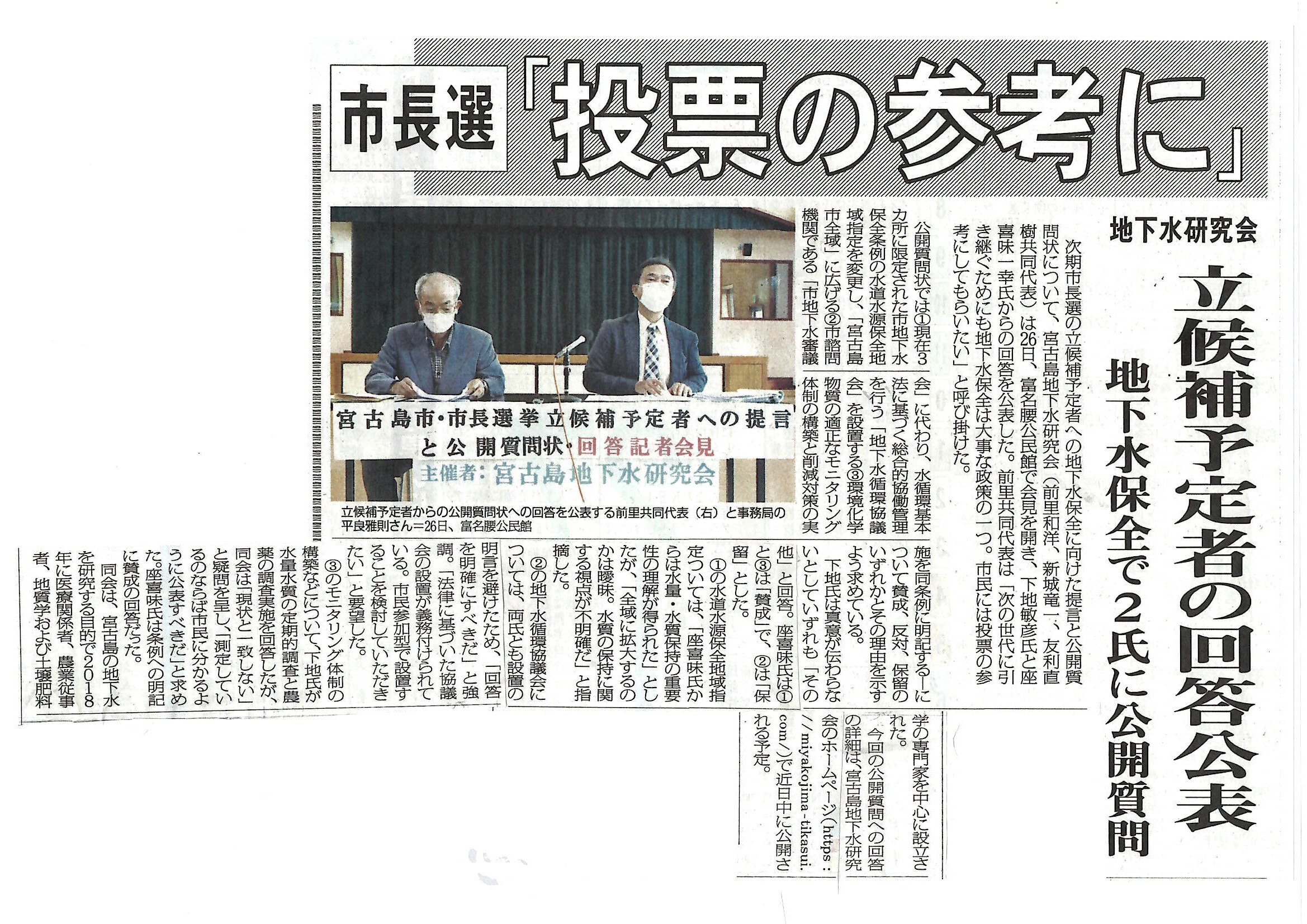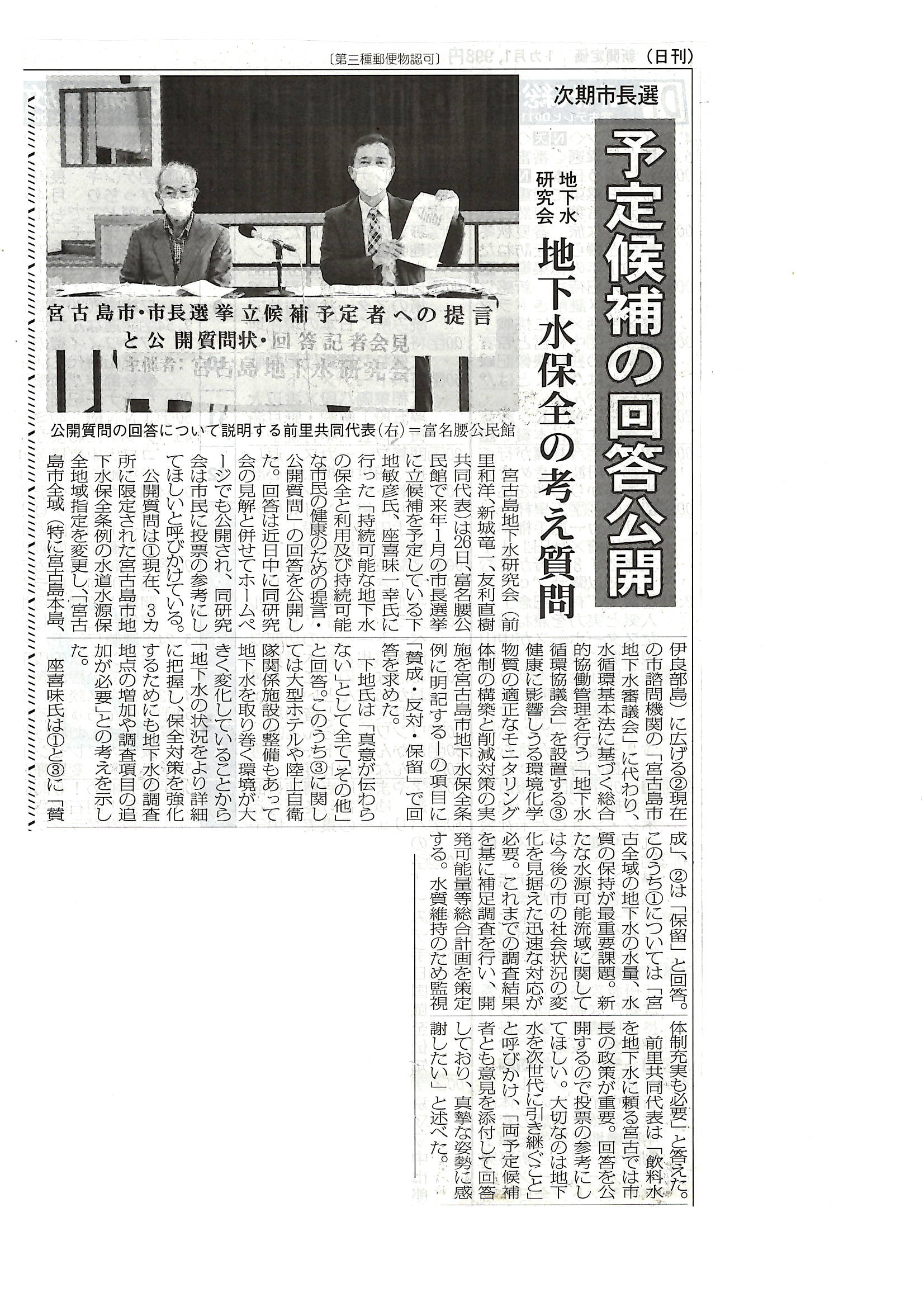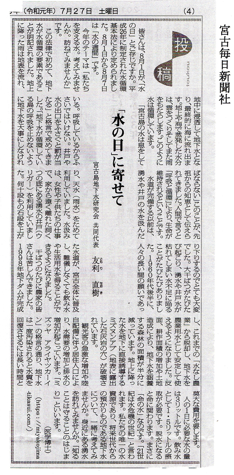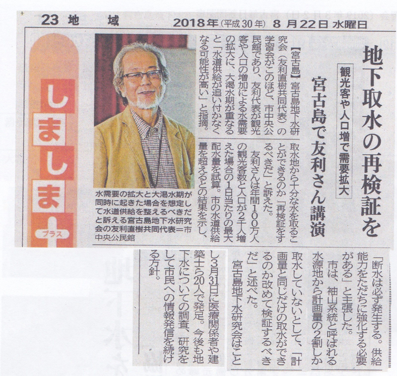 ●宮古新報:「命の水」地下水を子や孫そして将来世代にお返しするのが私達の責務。