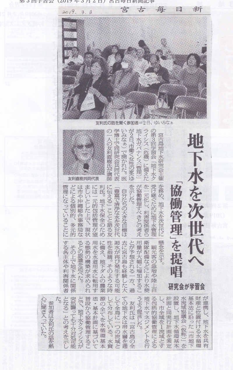 ●宮古毎日新聞:宮古島地下水研究会は、神戸大学大学院星信彦教授による市民講演会を開いた。