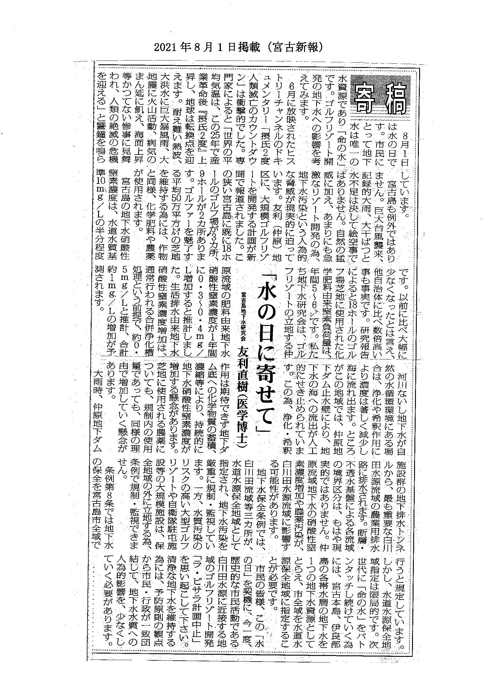 ●宮古毎日新聞:地下水を協働的に管理すること。水道水源保全地域を市全体に拡大する条例改正。地下水の現状を知り「命の水」を伝える決意が必要。